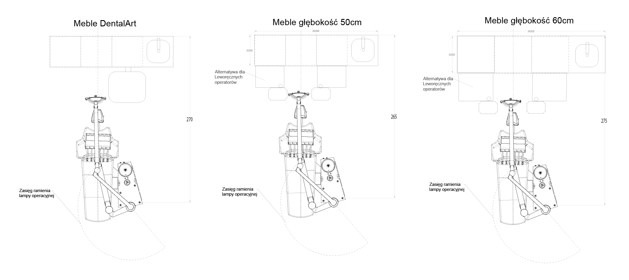 Nie rezygnujemy całkowicie z mebli, ale powinniśmy je dopasować do nowej wizji pracy i przechowywania. Ustaliliśmy, że strefy pracy operatorów łączą się na godzinie 12 i aby umożliwić obojgu łatwy dostęp do mebla - właśnie w tym miejscu powinien się znaleźć. Przy takim rozwiązaniu asysta ma łatwy, niewymagający wstawania, dostęp do blatu i szuflad w jej strefie pracy. Oczywiście nie ma pełnego dostępu do wszystkich szuflad, ale między innymi po to wprowadzamy system organizerów, aby nie był to problem. Jednocześnie taki mebel obsługuje omawianą tacę tworzącą podręczną przestrzeń roboczą. Ale jak to wszystko ułożyć, aby zachować ergonomię? Konsultując projekty naszych klientów, którzy zdecydowali się na unity XO, ustalamy odległości co do centymetra. Jest to kolejno 265 cm od punktu montażowego unitu do ściany za meblem w przypadku tacy zamontowanej na wysuwanym blacie i 270 cm dla mobilnej tacy Avant produkcji Dental Art. Wielkością jaką mają meble do gabinetu stomatologicznego możemy Was zszokować – optymalna to 2 metry szerokości. Mają 50 cm głębokości i cztery segmenty po 50 cm szerokości , w tym jeden przeznaczony na zlew i kosze – naprawdę nie potrzeba więcej.