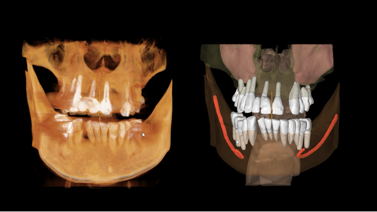 Dzięki temu dalsza praca i diagnoza są o wiele łatwiejsza i bardziej intuicyjne – struktury są maksymalnie klarowne, nie trzeba się już poruszać po przekrojach 2D, a program na bieżąco śledzi nasze czynności i wspiera np. przy planowaniu implantów.